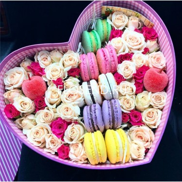 Розы кустовые Бомбастик и Фаленопсис, макаронс в коробке сердце